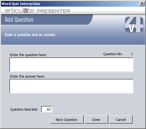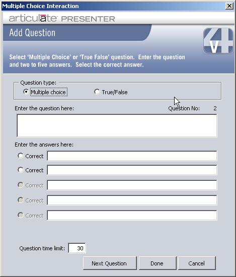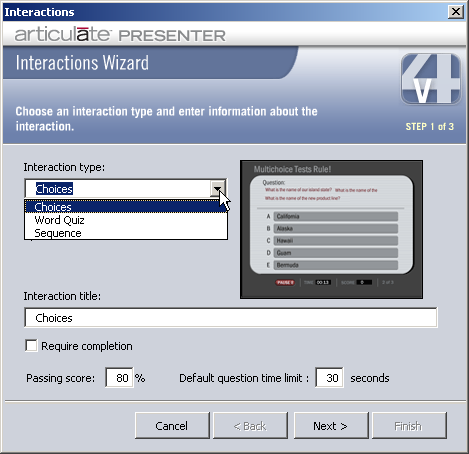 Multiple choice and True/False questions. The user's objective is to select the correct answer before time runs out. If you will be Tracking Using Quiz Results in an LMS, you must choose Choices as your Interaction type. |